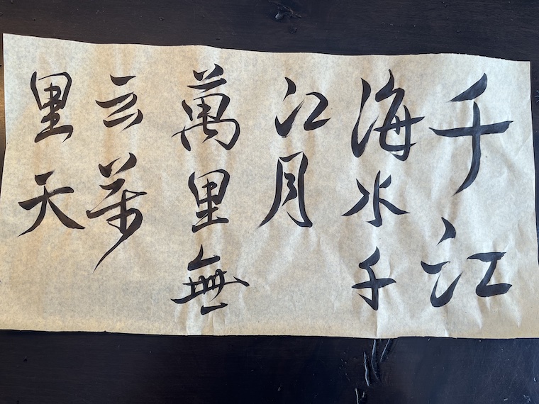 比如,老师说我写的这个整体上气就是散的。因为写书法最好是写竖不写横。竖着写才能有“行气”,才能写得出气派来,横着写首先气势上就矮掉了。然后细节上讲,江,比如这个“千江”,她说这个“江”字就写得太松,字左右两边的距离太大了;还有这个“万”字,整个字,这个字有上中下三个部分,我写的是下面大上面小,头轻脚重结构比例不和谐。这个都是“布白”,“结体”的问题。