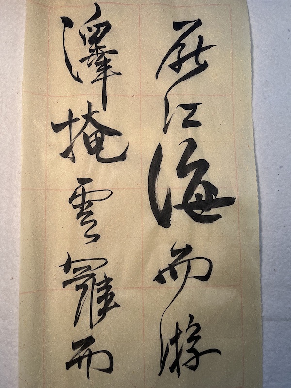 我的书法老师很欣赏我。她觉得我是零基础学的书法,然后跟她学的时间也不长,字写得够老,够劲。当然了,很多地方细节之处还需要进一步的学习改进,但总体来说,写到今天,她对我很满意。